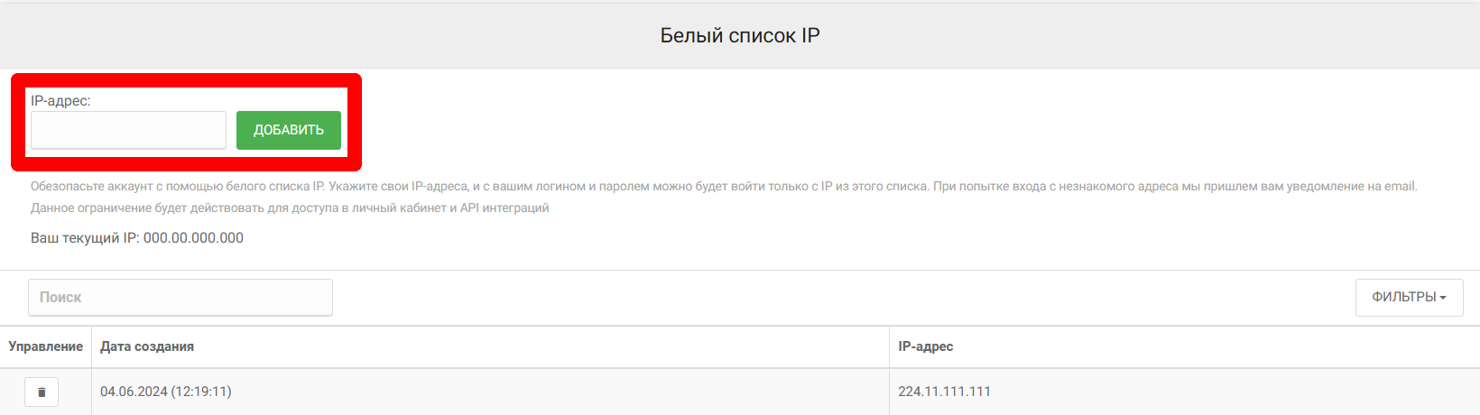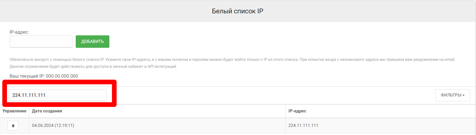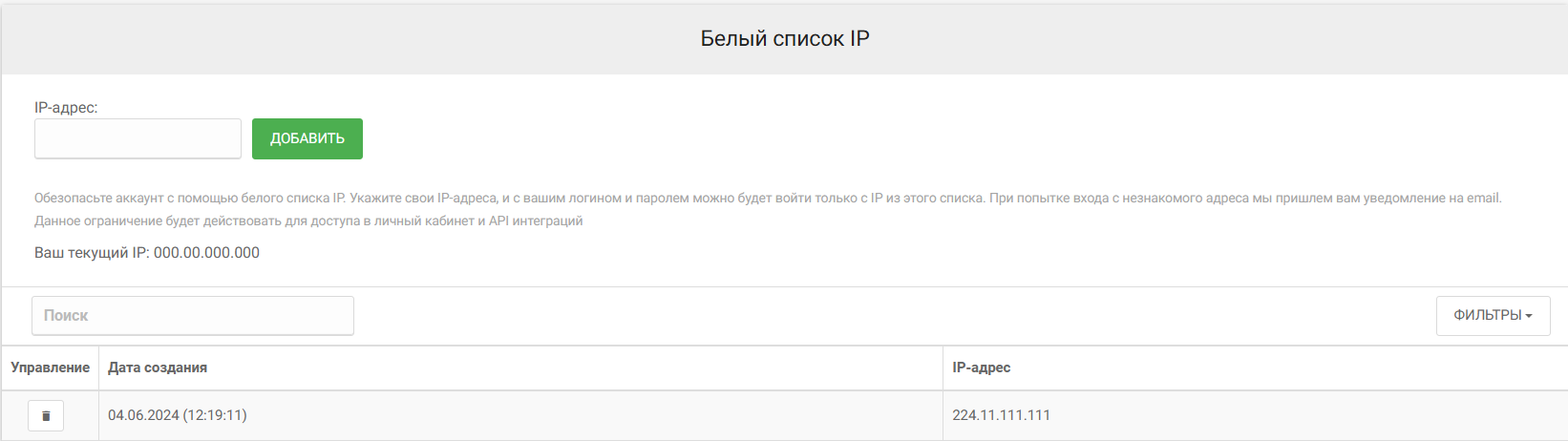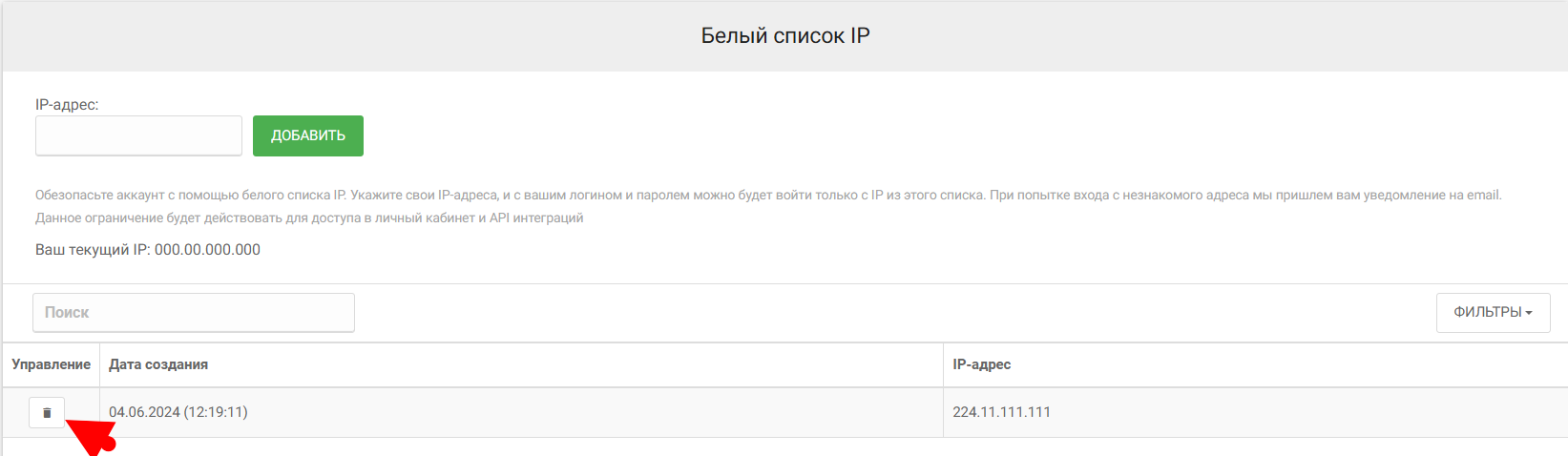 Для удаления IP-адреса из белого списка Вам необходимо нажать на кнопку “Удалить”, которая находится в столбце “Управление” слева от IP-адреса.