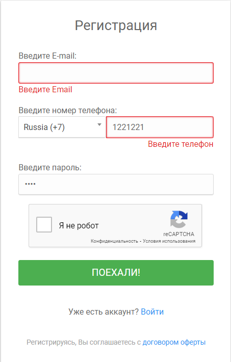 Если при вводе данных допущена ошибка или введены неподходящие данные, то в одном из полей появится ошибка с описанием. Пример: ошибки “Введите Email” и “Введите телефон”.