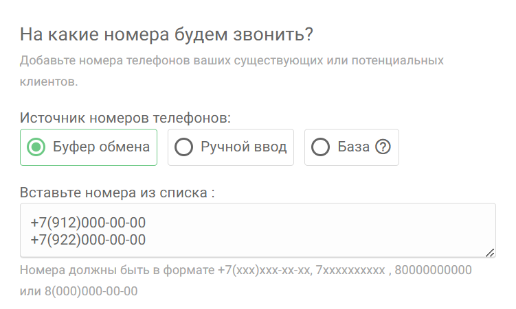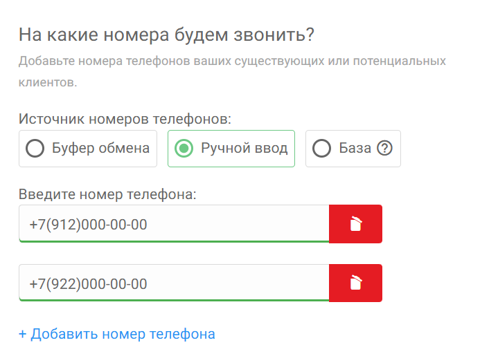 С помощью данного источника Вы можете ввести номера вручную. Если нужно добавить больше одного номера, нажмите на кнопку “Добавить номер телефона”. Для удаления введенного номера нажмите на знак “Корзина” рядом с введенным номером.