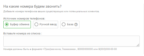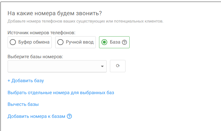 1. Выбрать ранее созданную базу номеров в выпадающем списке (из раздела “Базы номеров”);