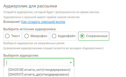 Используя данный источник, Вы можете выбрать ранее созданный аудиоролик (из раздела “Аудиоролики”). Для выбора аудиоролика необходимо выбрать искомый аудиоролик из выпадающего списка.