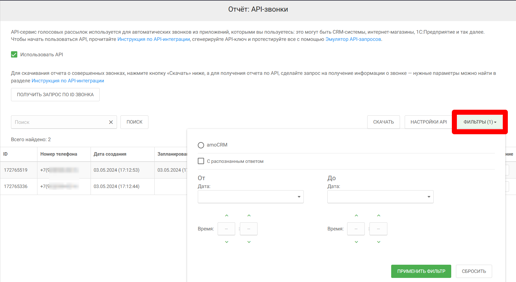 С помощью данного функционала Вы можете отобрать API-звонки по определенным параметрам, что облегчит поиск необходимых вызовов.