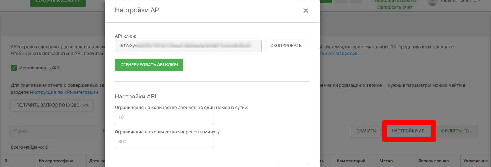 При нажатии кнопки перед Вами откроется диалоговое окно “Настройки API”, где Вы можете скопировать или сгенерировать API-ключ и посмотреть текущие лимиты API-звонков (лимит звонков на один номер в сутки и количество запросов в минуту).