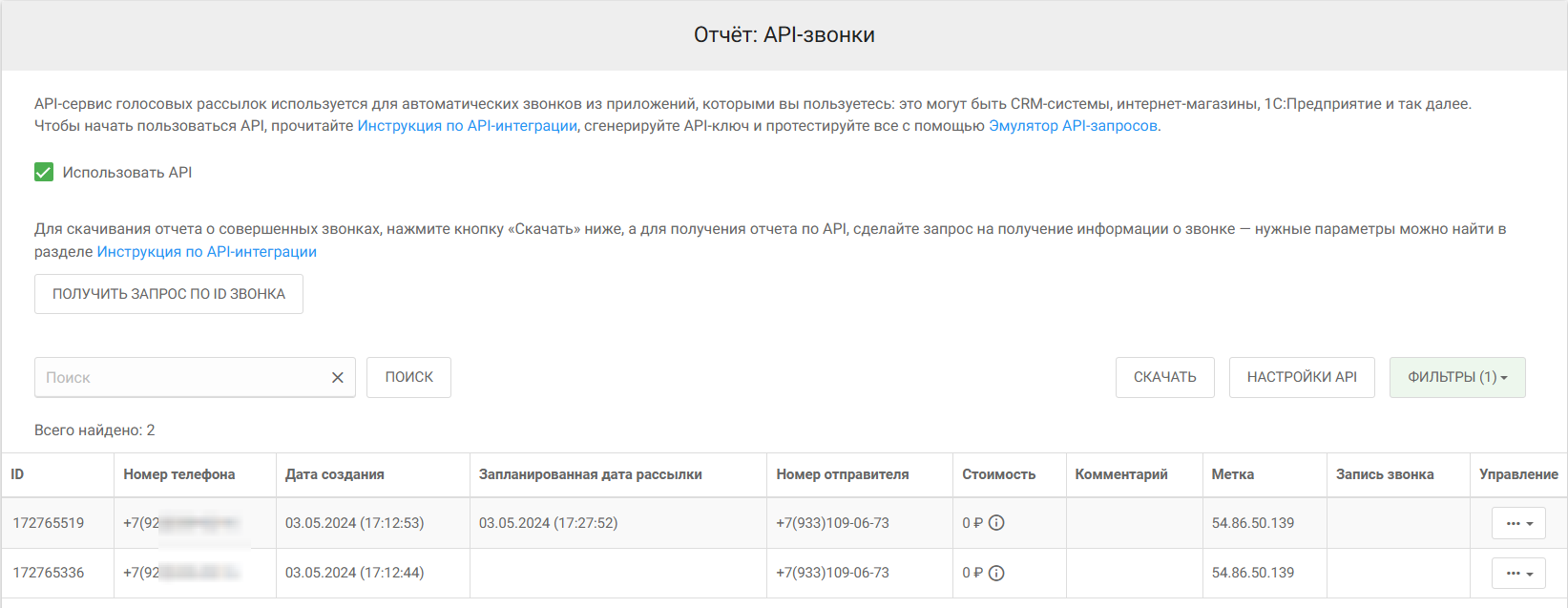 Таблица предназначена для просмотра отчета по созданным API-звонкам.