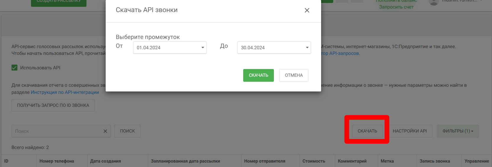 При нажатии кнопки “Скачать” откроется диалоговое окно “Скачать API звонки”, где Вы можете выставить необходимый период и скачать отчет в формате CSV со всеми звонками за указанный период.
