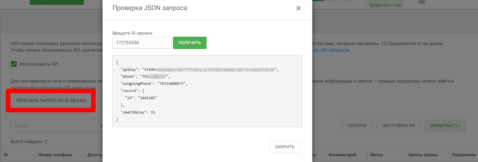 При нажатии кнопки “Получить запрос по ID звонка” откроется диалоговое окно “Проверка JSON запроса”, где можно ввести ID API-звонка и получить полное отправленное тело запроса в формате JSON.