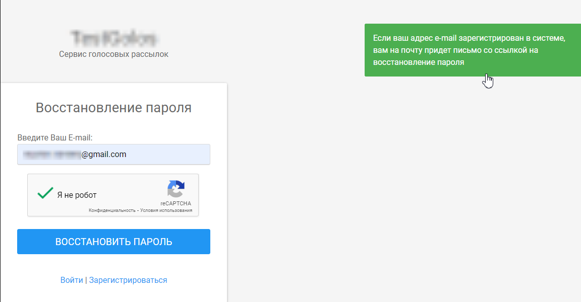 Если введен верный Email, а проверка reCAPTCHA успешно пройдена, то на указанный Emil придет письмо со ссылкой на восстановление пароля.