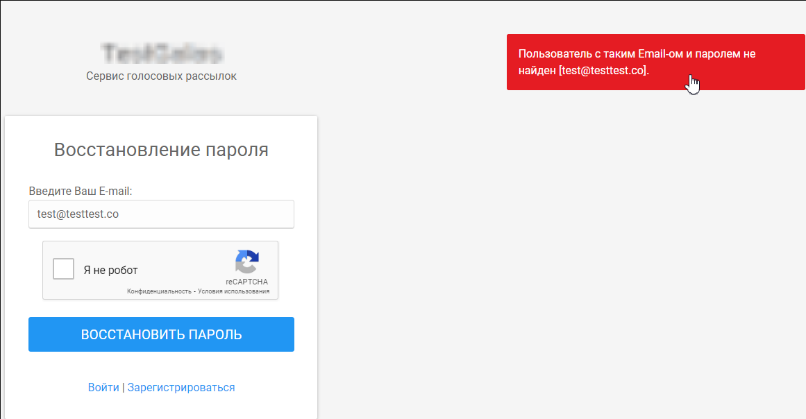 Если при вводе данных допущена ошибка, либо пользователь с такими данными еще не зарегистрирован в системе, то появится ошибка “Пользователь с таким Email-ом и паролем не найден [Введенный email]”.